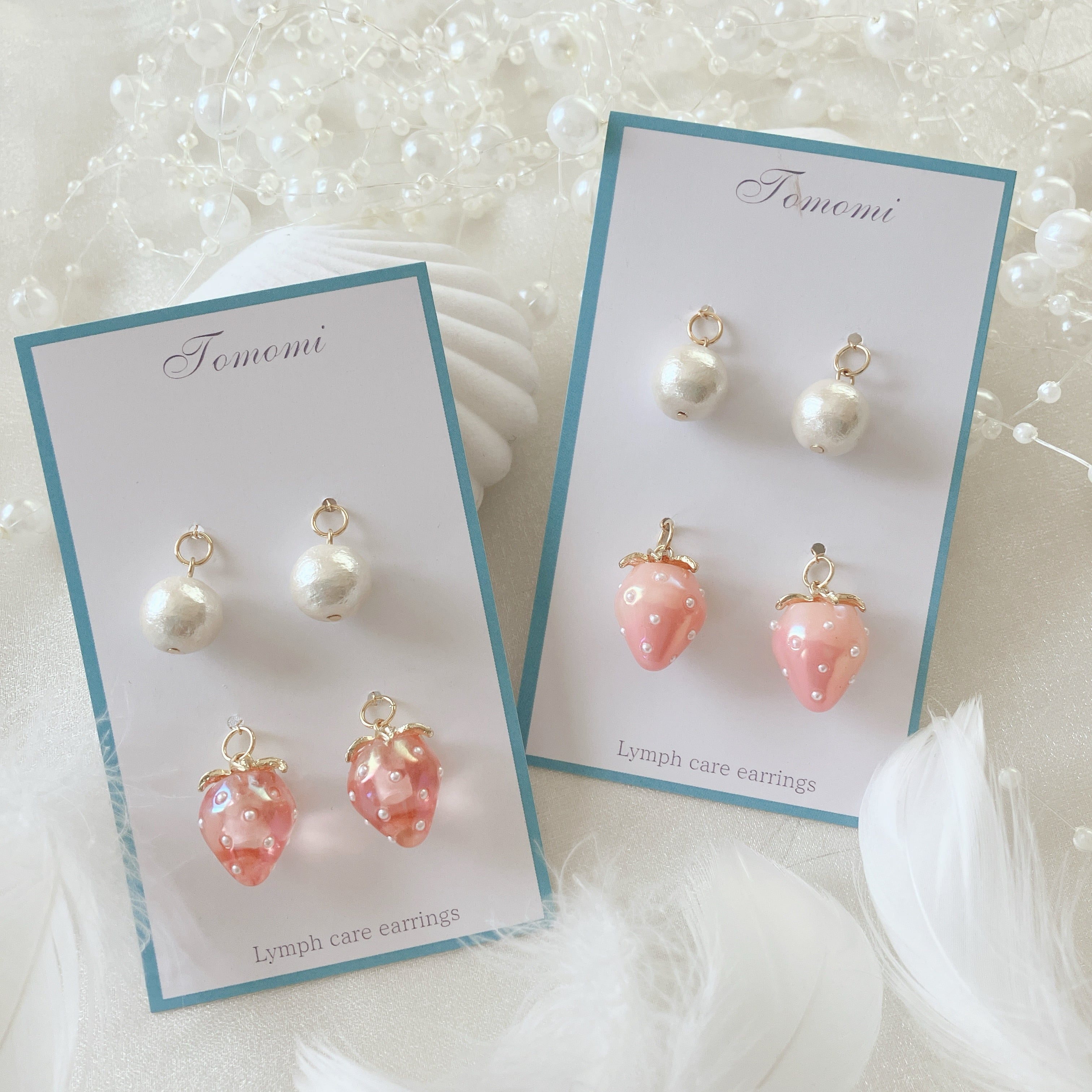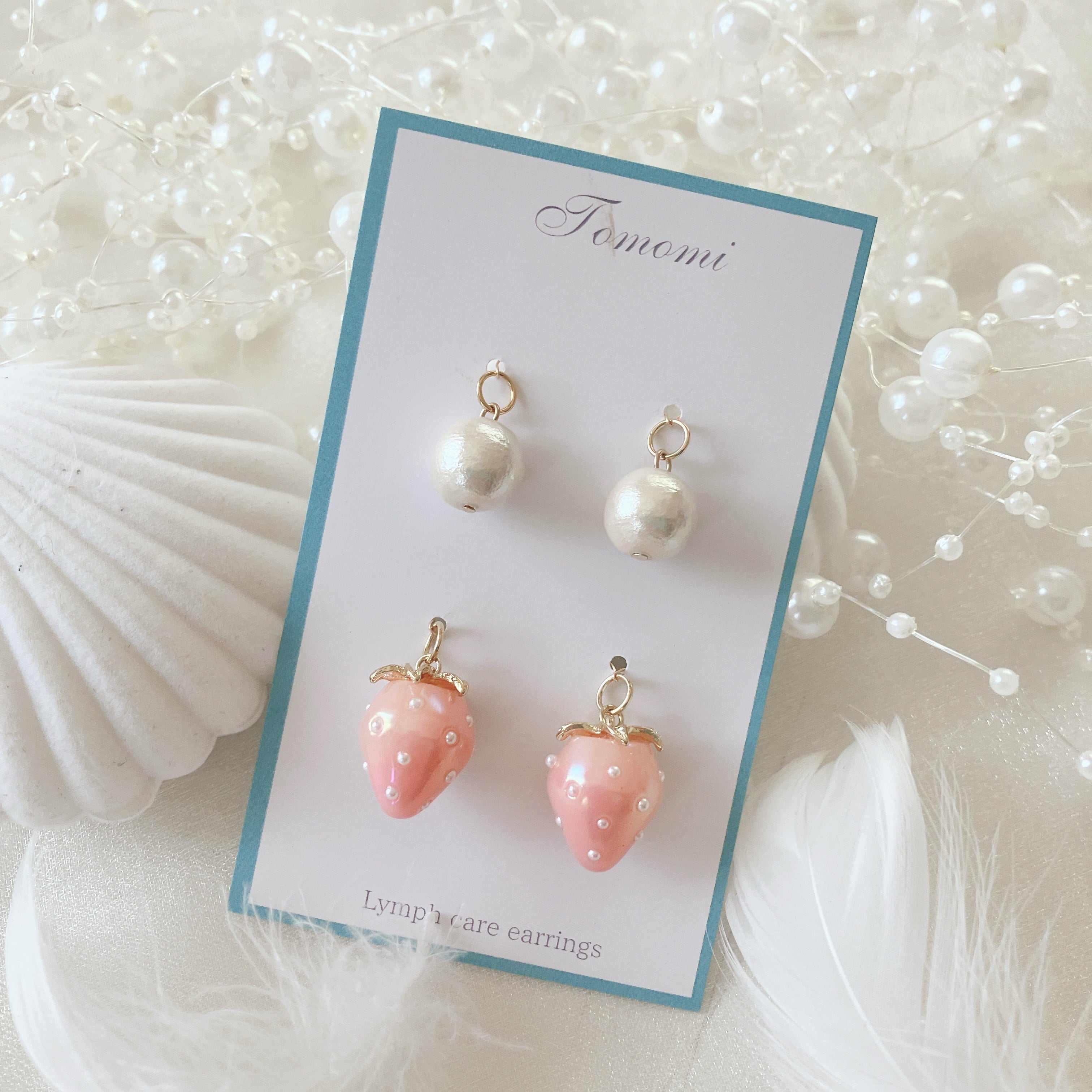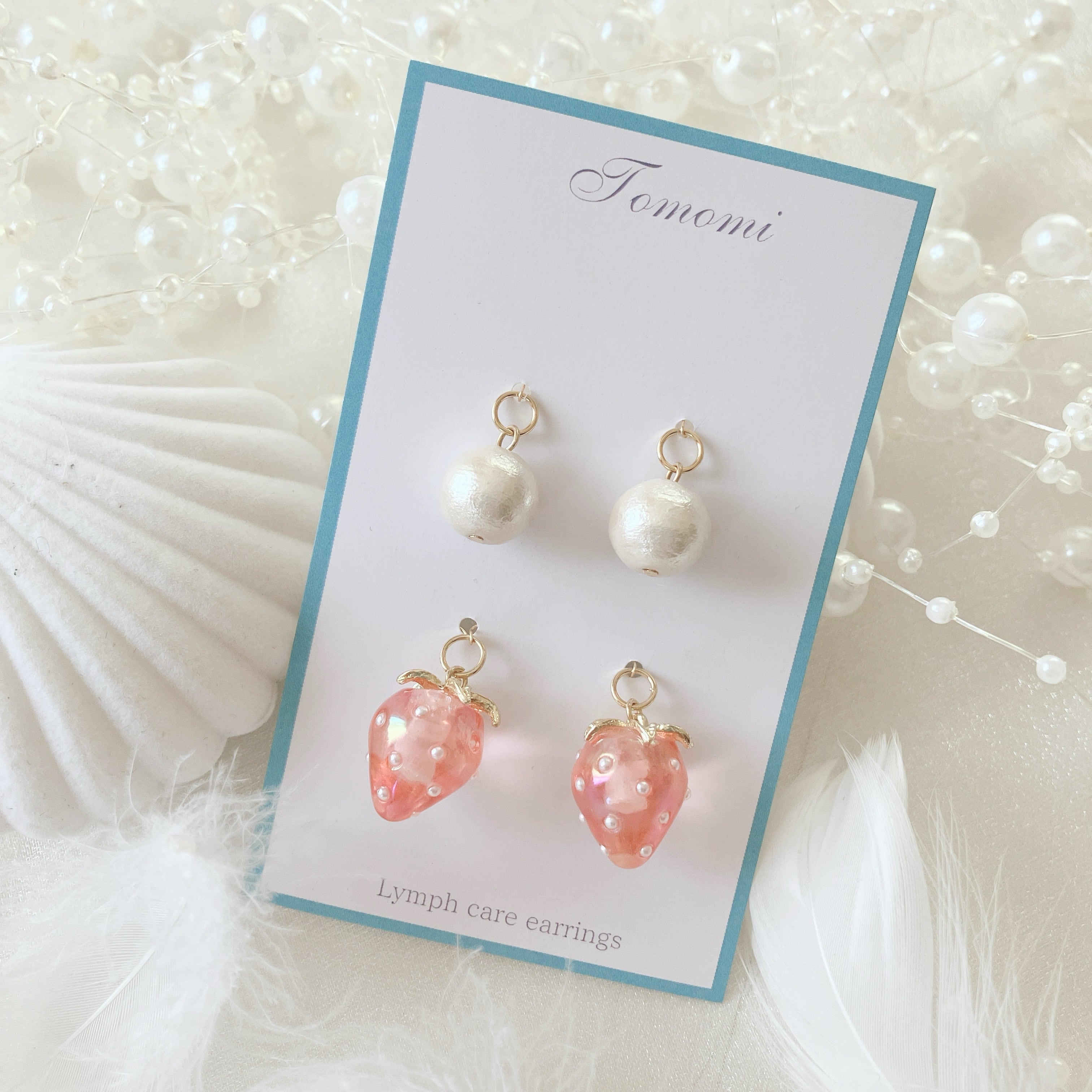 苺にコットンパールを加えることで、大人っぽさがプラスされ、幅広い年代で楽しめるデザインです。もちろん、苺だけ、パールだけで楽しむこともできるので3wayで楽しめます。