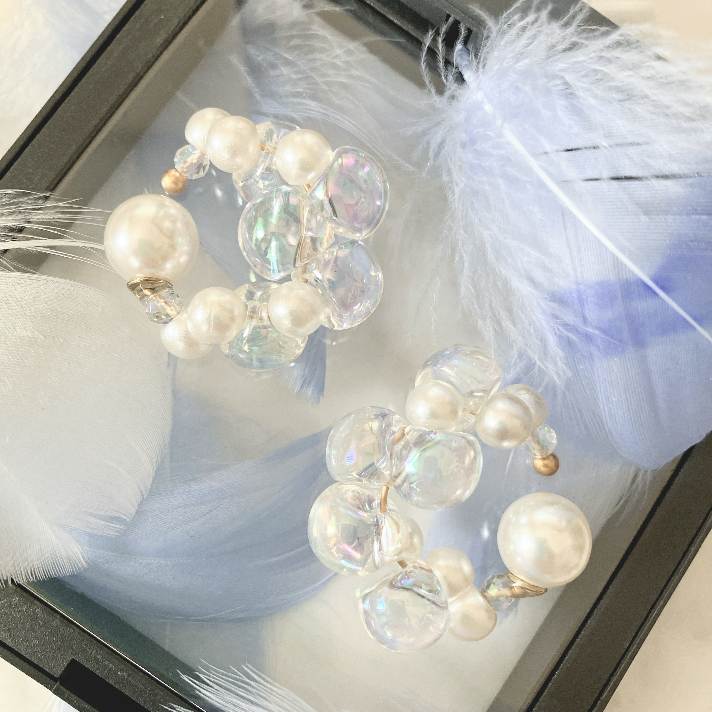 シャボン玉のようなオーロラコーティングを施されたアクリルビーズをメインにパールやオーロラコーティングを施したクリスタル(水晶)をセッティング。見た目よりも軽い付け心地です。