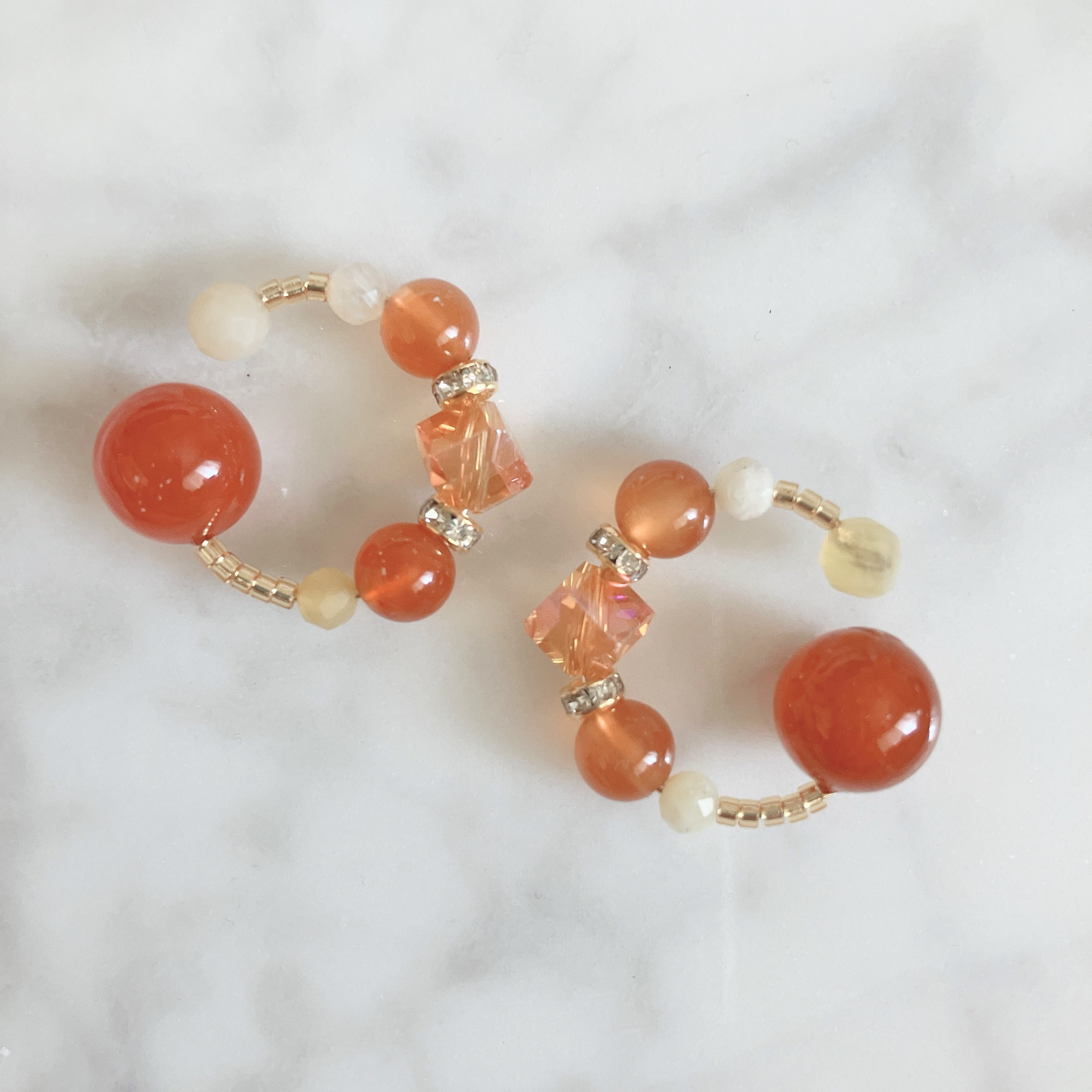 約5.5ミリAA++のイエローオパール、約4ミリサイズAA++のイエローオパール、約6ミリサイズAAAのカーネリアン、キューブカットガラスビーズを組み合わせた華やかですが肌馴染み良く透明感あるデザインです。耳たぶ裏のツボ翳風(えいふう)にフィットさせる玉には約10ミリサイズAAAのカーネリアンを使用。