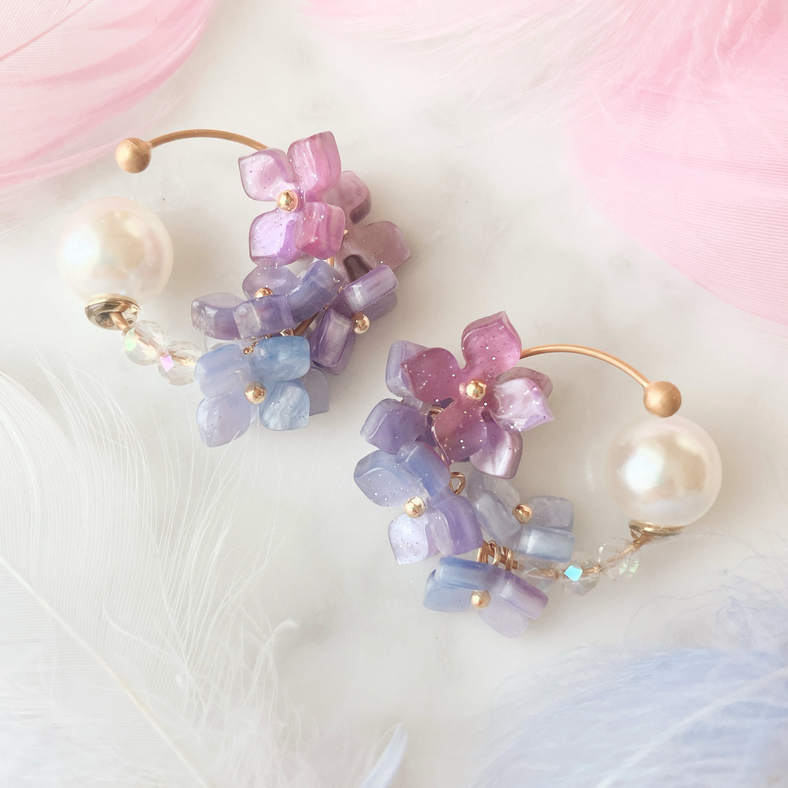 紫陽花を6つずつセッティング。4ミリサイズのオーロラクリスタル(水晶)を3石ずつセッティングしております。紫陽花はブルー〜赤紫系のグラデーションになります。紫陽花の濃淡や色みの出方はお一つずつ個体差がございます。