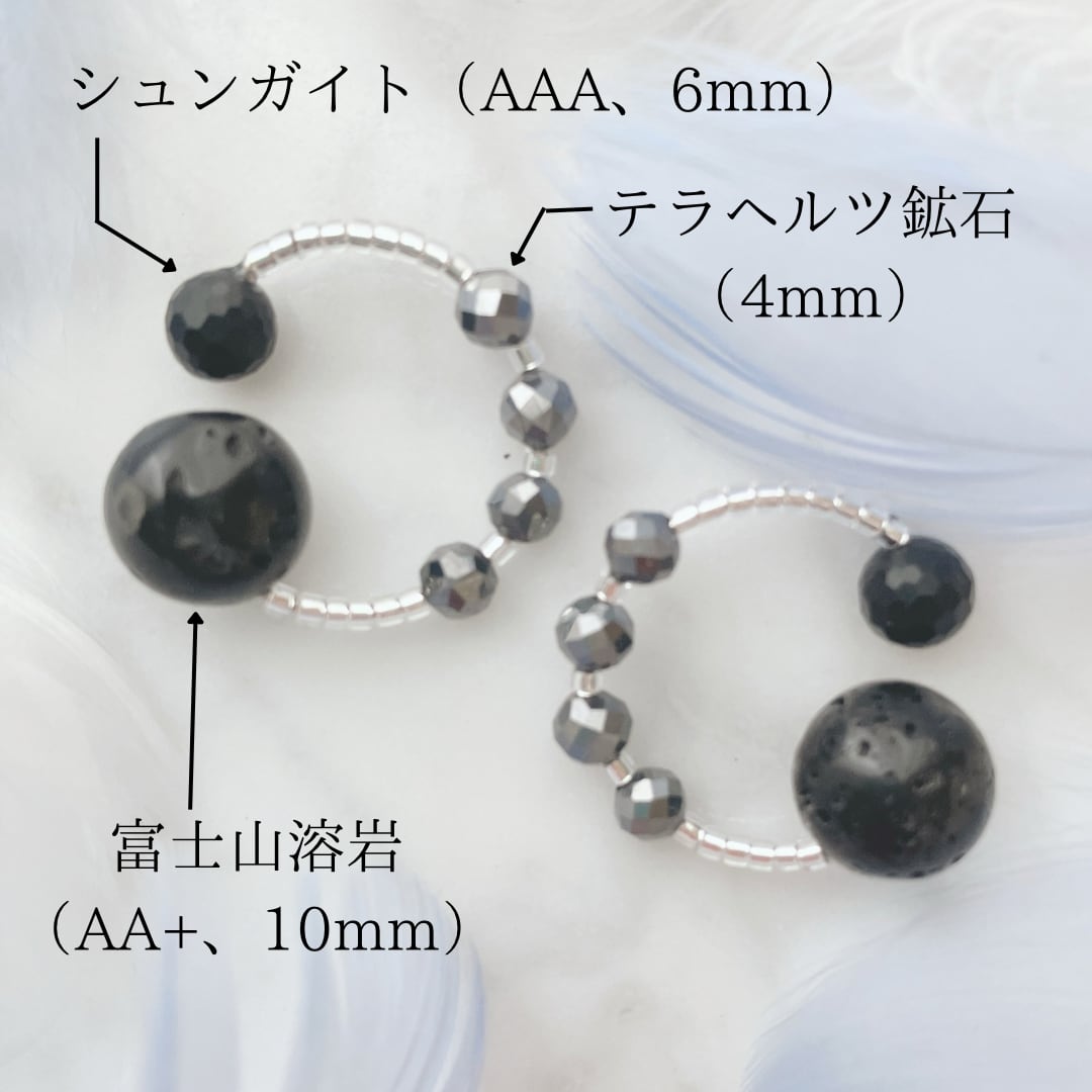 耳たぶ裏の翳風(えいふう)にフィットさせる大きな玉は富士山溶岩(AA+、10mm)、反対側の小さな玉は、シュンガイト(AAA、6mm)、中央部にはテラヘルツ鉱石(4mm)を4石、石と石の間にはビーズを入れてあるため金属に触れることなくお使いいただけます。また、小さい玉の大きさが他のカフに比べ大きくなっているためソフトな付け心地となっております。