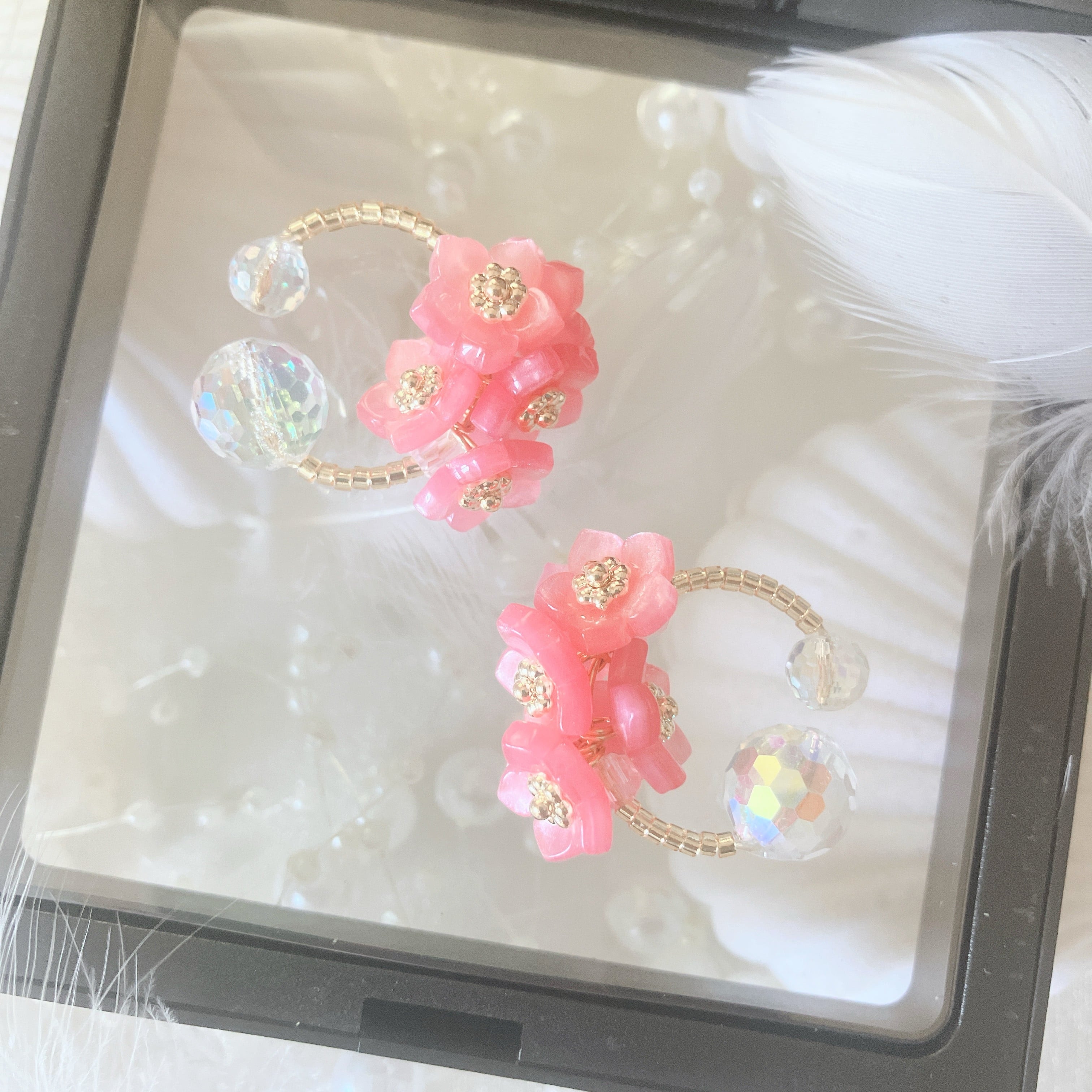 翳風(えいふう)にフィットさせる玉は10ミリサイズのキラキラ煌めくオーロラビーズ、内側に当てる玉は6ミリサイズのオーロラビーズをセッティング。ゴールドカラーのビーズは、透明なビーズの内側にゴールドカラーを施したガラスビーズです。
