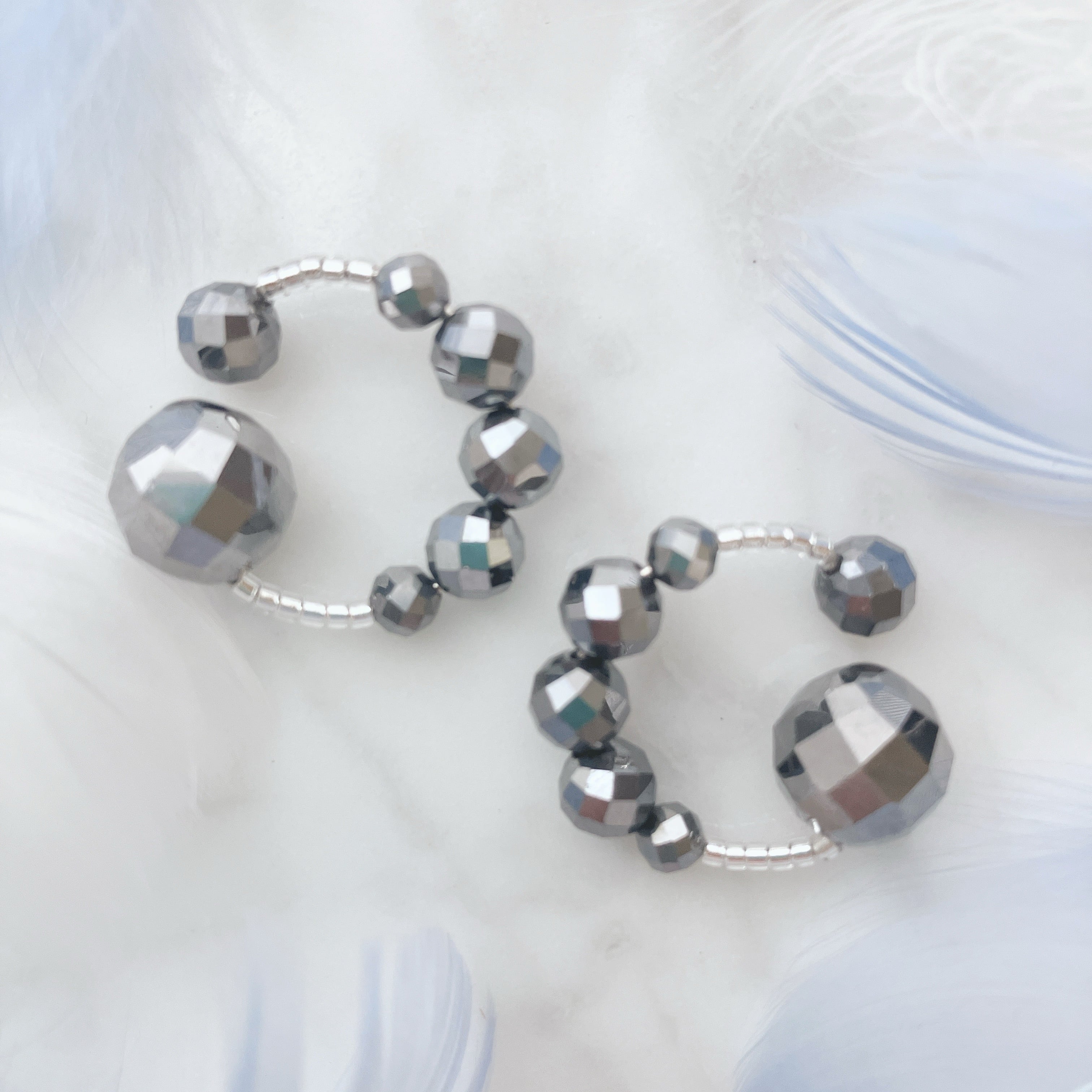 翳風(えいふう)に当てる玉は約10ミリサイズのテラヘルツ、耳の内側に入れる玉は約6ミリサイズのテラヘルツです。リングは約20ミリサイズのシルバーカラー。間には、ガラスビーズと4ミリサイズと6ミリサイズのテラヘルツをセッティング。