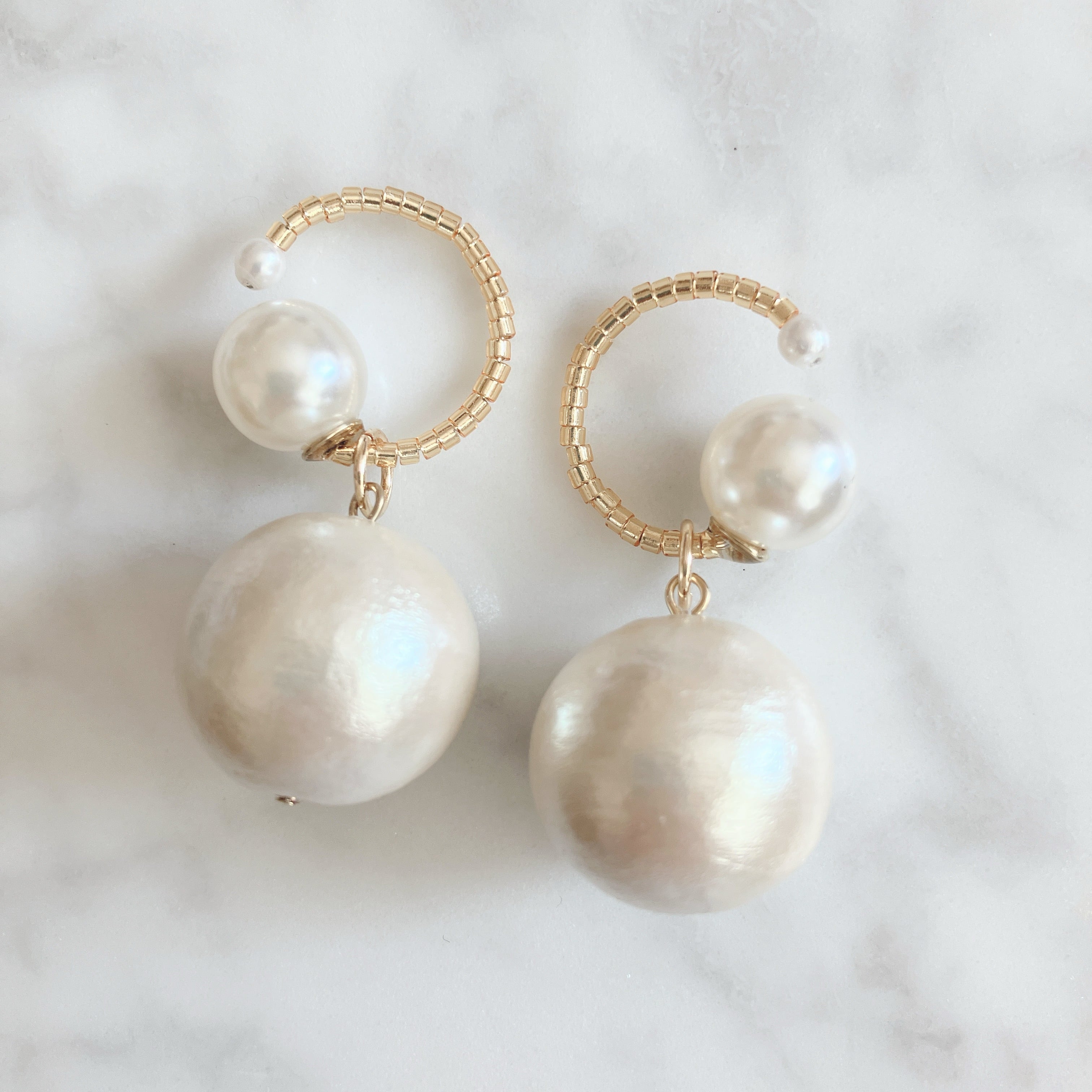 チャームは取り外し可能。コットンパールの色は真っ白ではなく黄みのあるキスカになります。コットンパールは約18ミリサイズ。