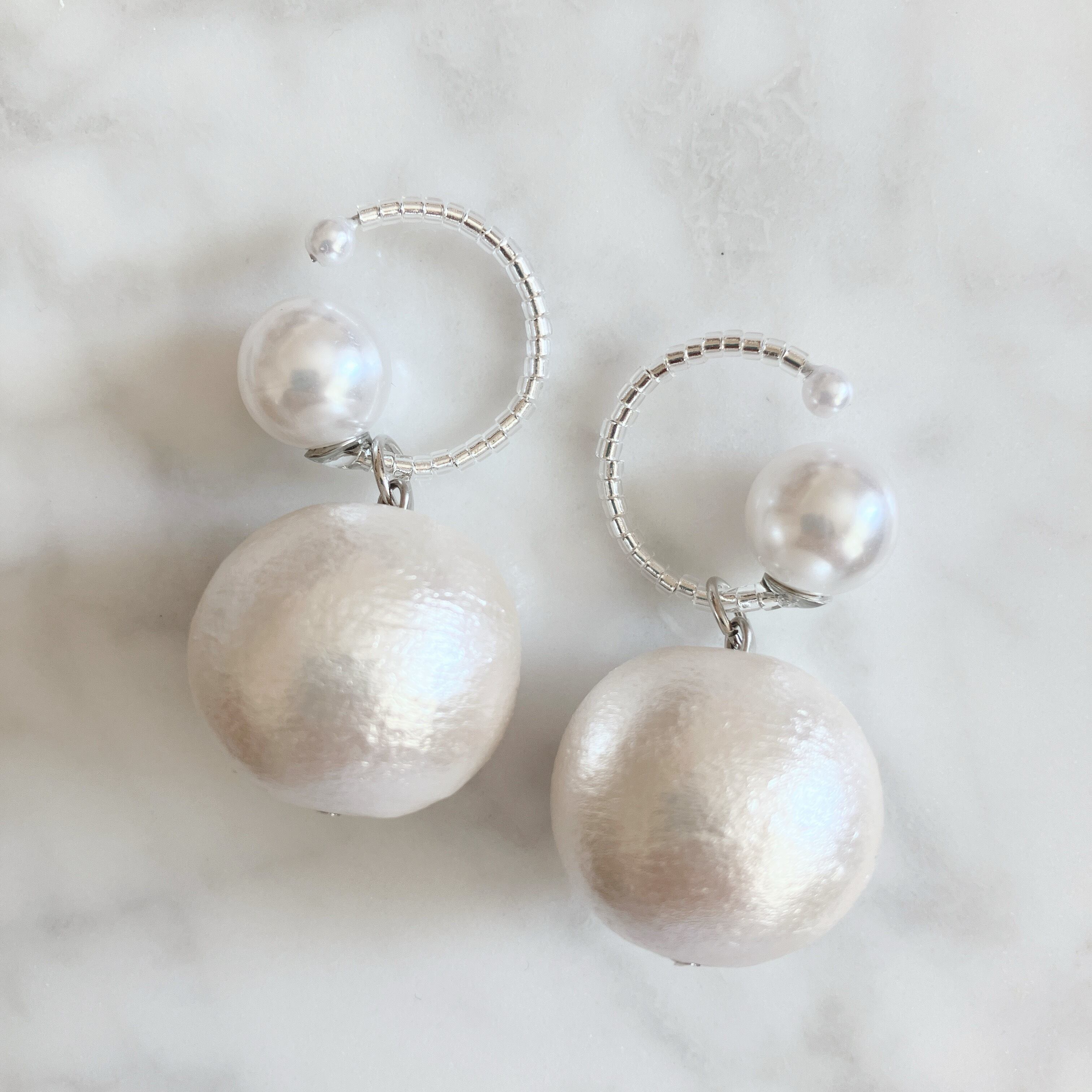 金属アレルギー対応のシンプルカフは2サイズ展開。コットンパールは約20ミリのピュアホワイト(真っ白)。