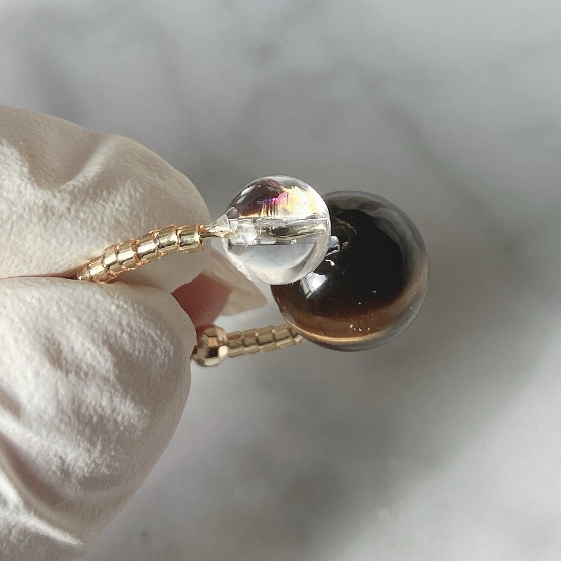 仕様 : リングのサイズ、内径約20ミリのゴールドカラー。翳風(えいふう)に当てる大きな玉は10ミリのイエロータイガーアイ、一番小さいゴールドのビーズは透明なガラスビーズの内側にゴールドカラーを施したもの。はの次は、3ミリと4ミリのK18コーティングのゴールドコッパービーズです。ゴールドコッパービーズは高品質で変色しにくく綺麗が長持ちします。ルチルクォーツは、約6ミリサイズ(AA++)、アイリスクォーツ6ミリは角度により虹が見える水晶です。