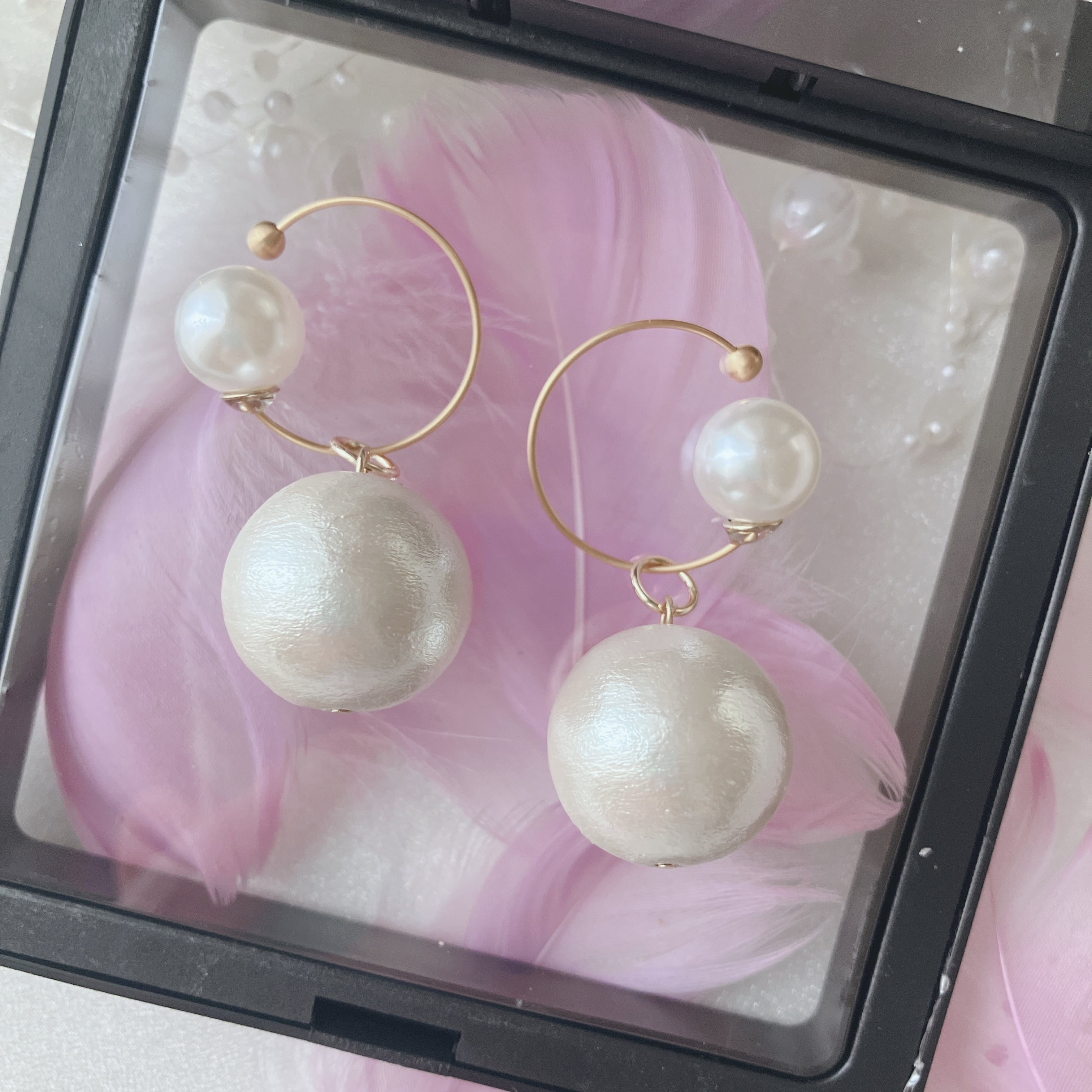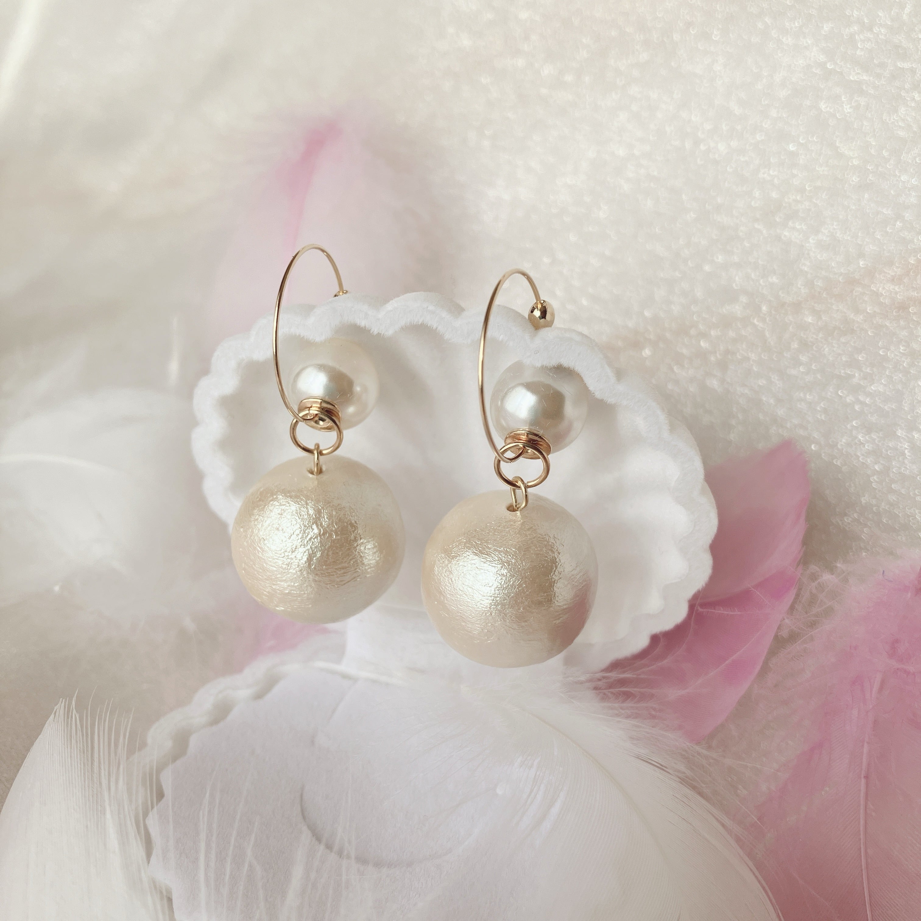 カフ装着時は前から見ると一粒のコットンパールのみが見えます(カフの玉が耳の後ろにくるため)。