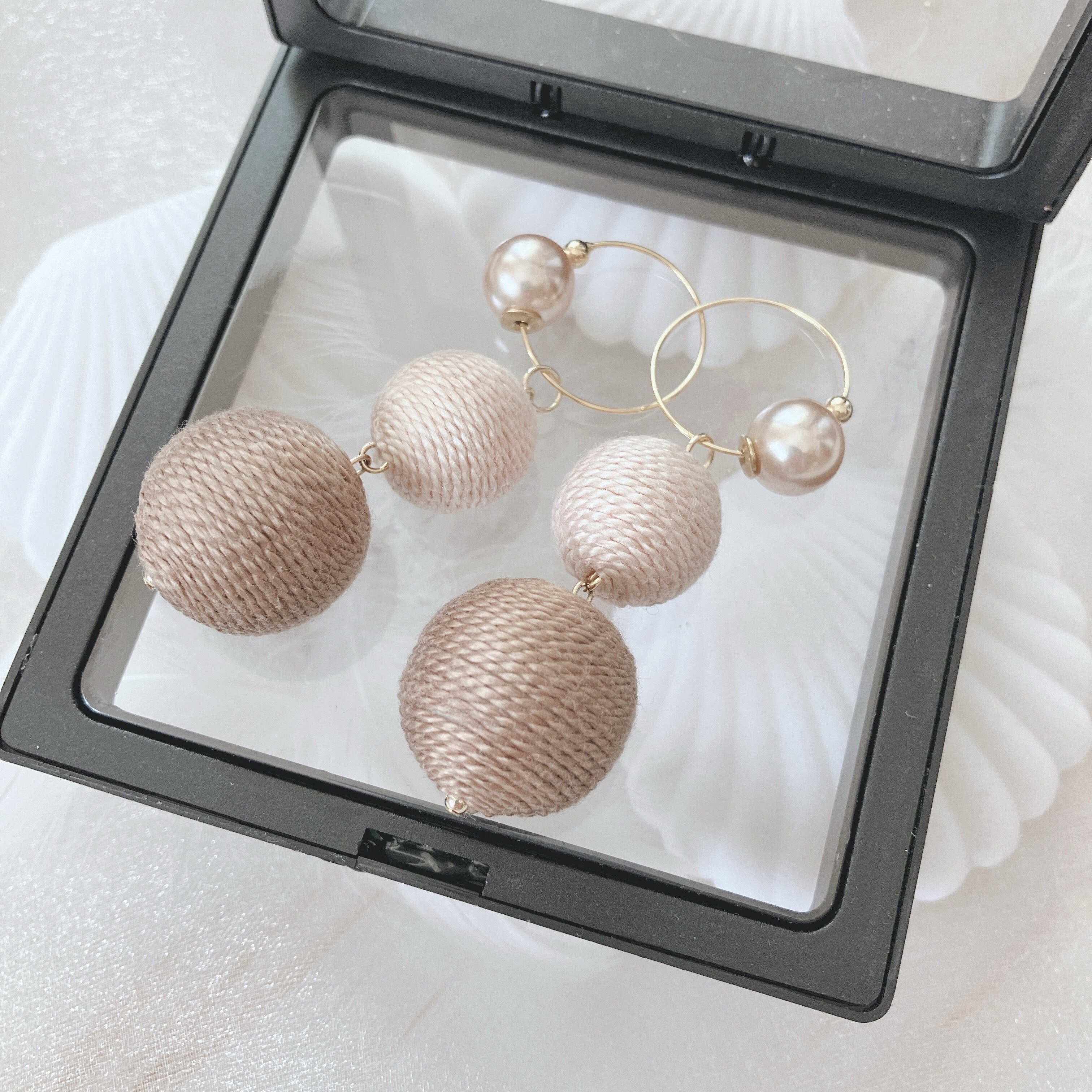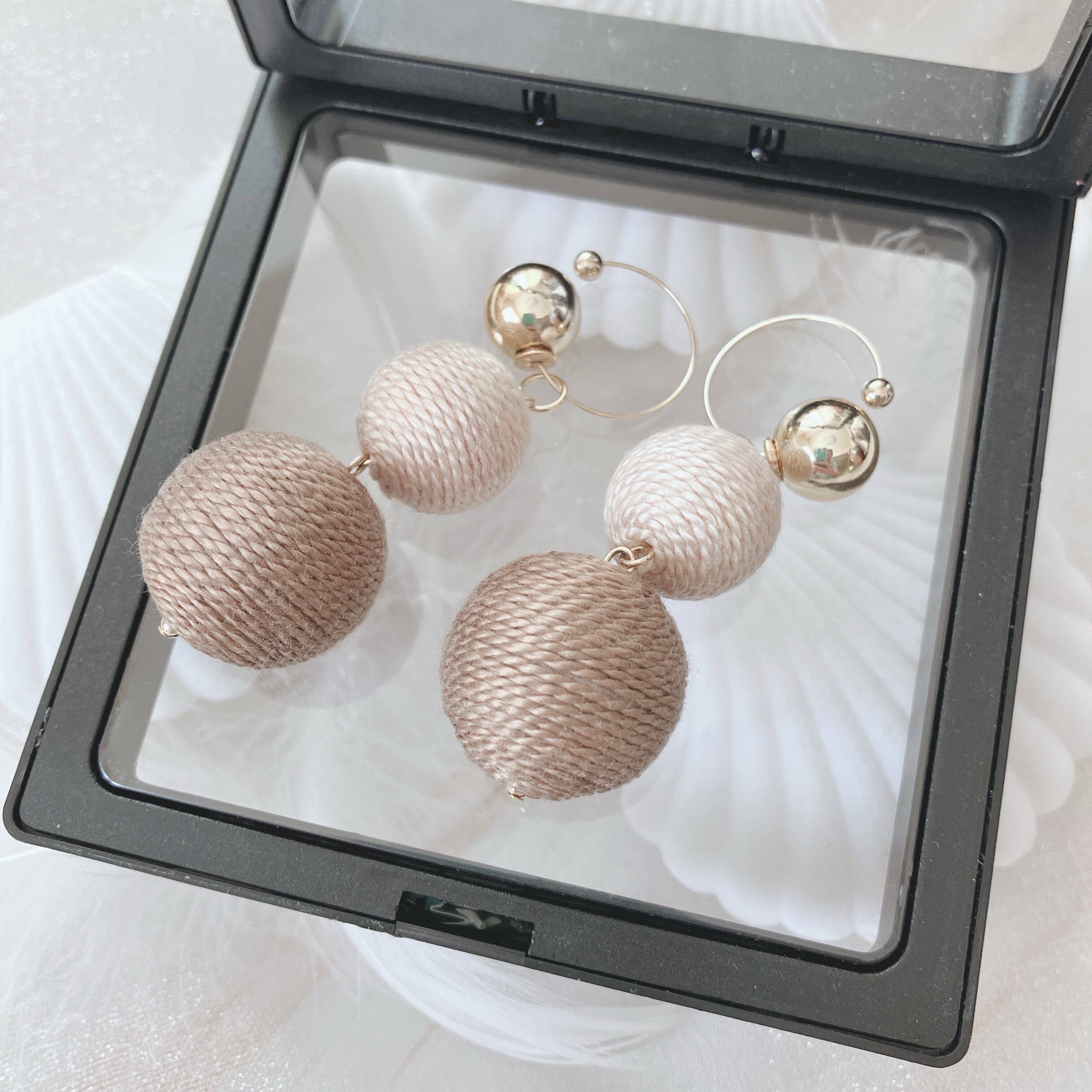 ボンボンは糸から手作業で巻いて作っております(ライセンス取得済み)。下玉がブラウン約20ミリ、上玉がベージュ約15ミリになります。とても軽くて付けていて負担になりません。
