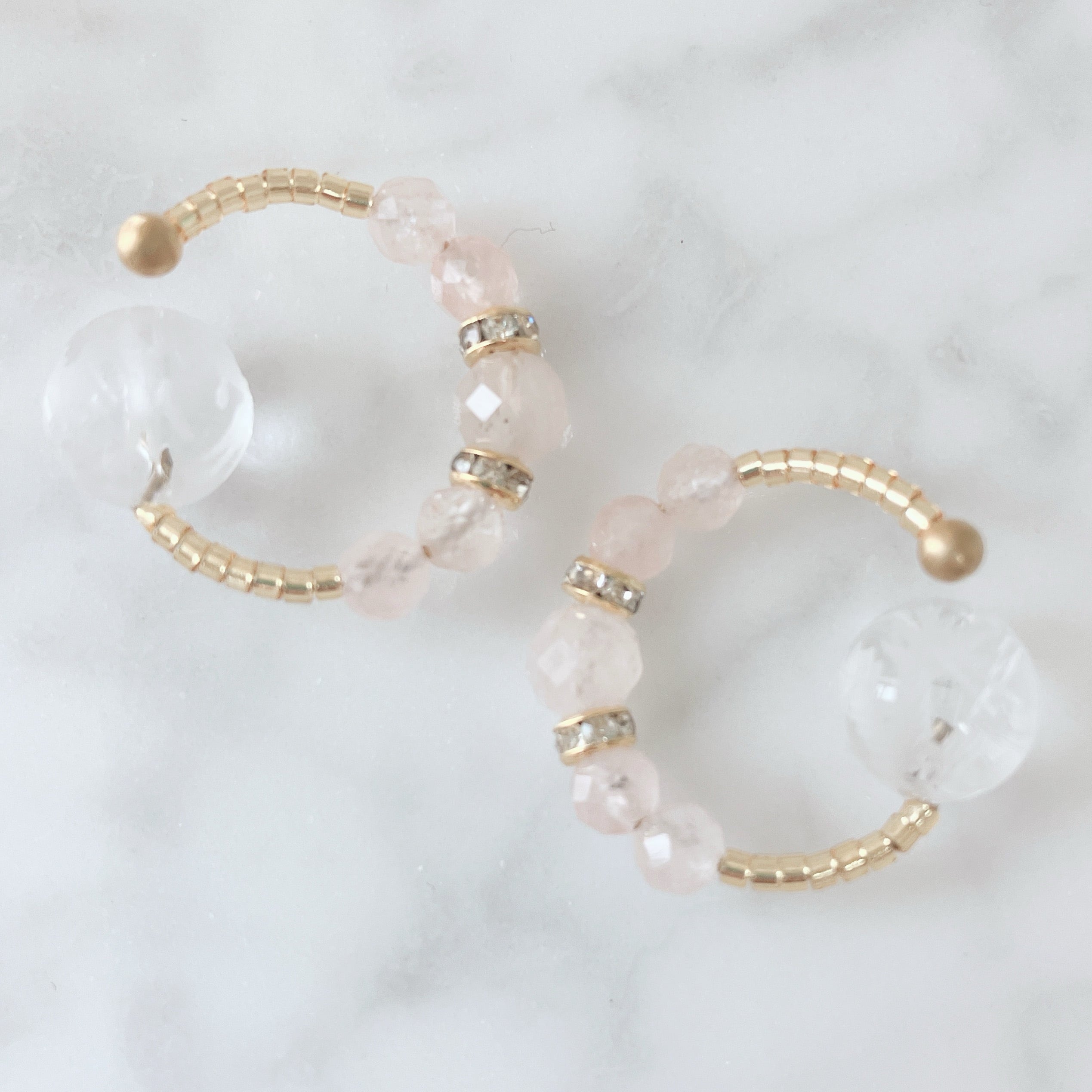 こちらのビューティーカフは、モルガナイトのラウンドカットの天然石を5粒ずつセッティング。優しいピンクがふんわりとした女性らしさを引き立てます。重ね付けしても邪魔にならないデザインです。
