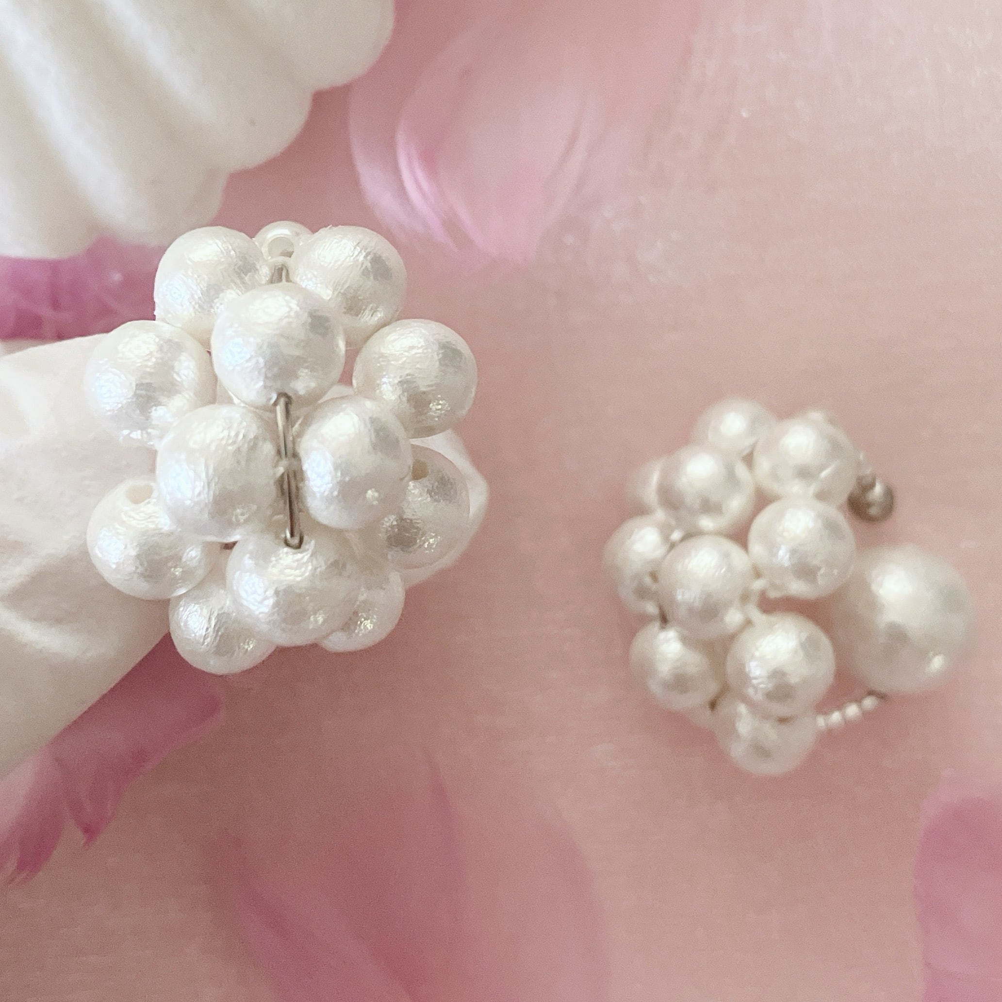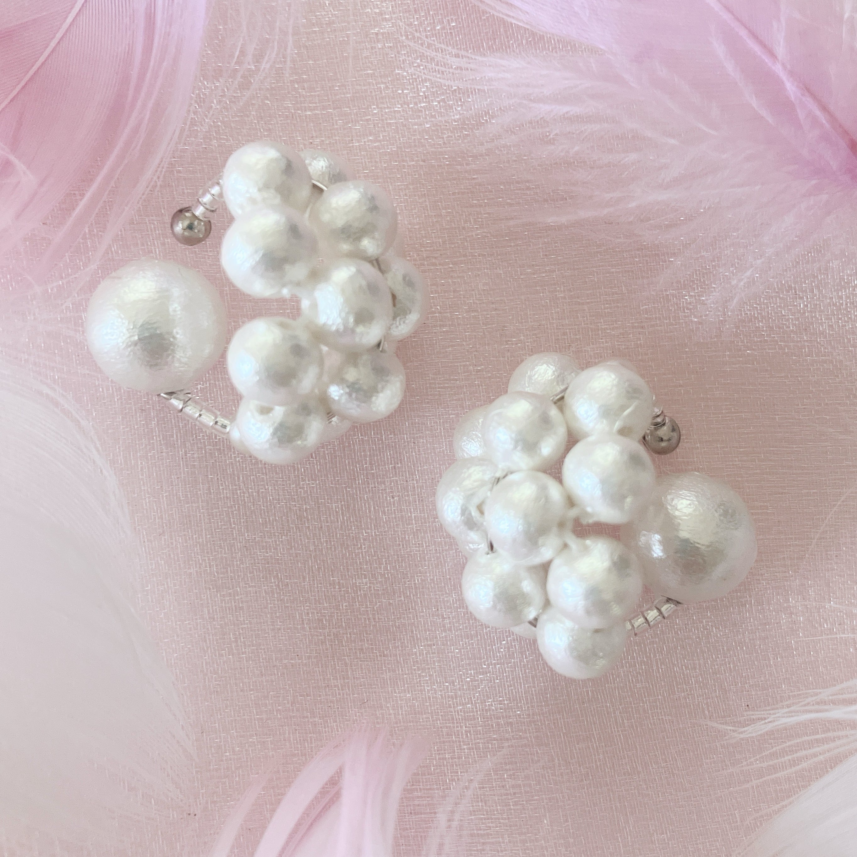 ◉翳風(えいふう)にフィットさせる玉は10ミリサイズのコットンパール。パールのサイズ変更(12ミリ)ご希望の方はお問合せください