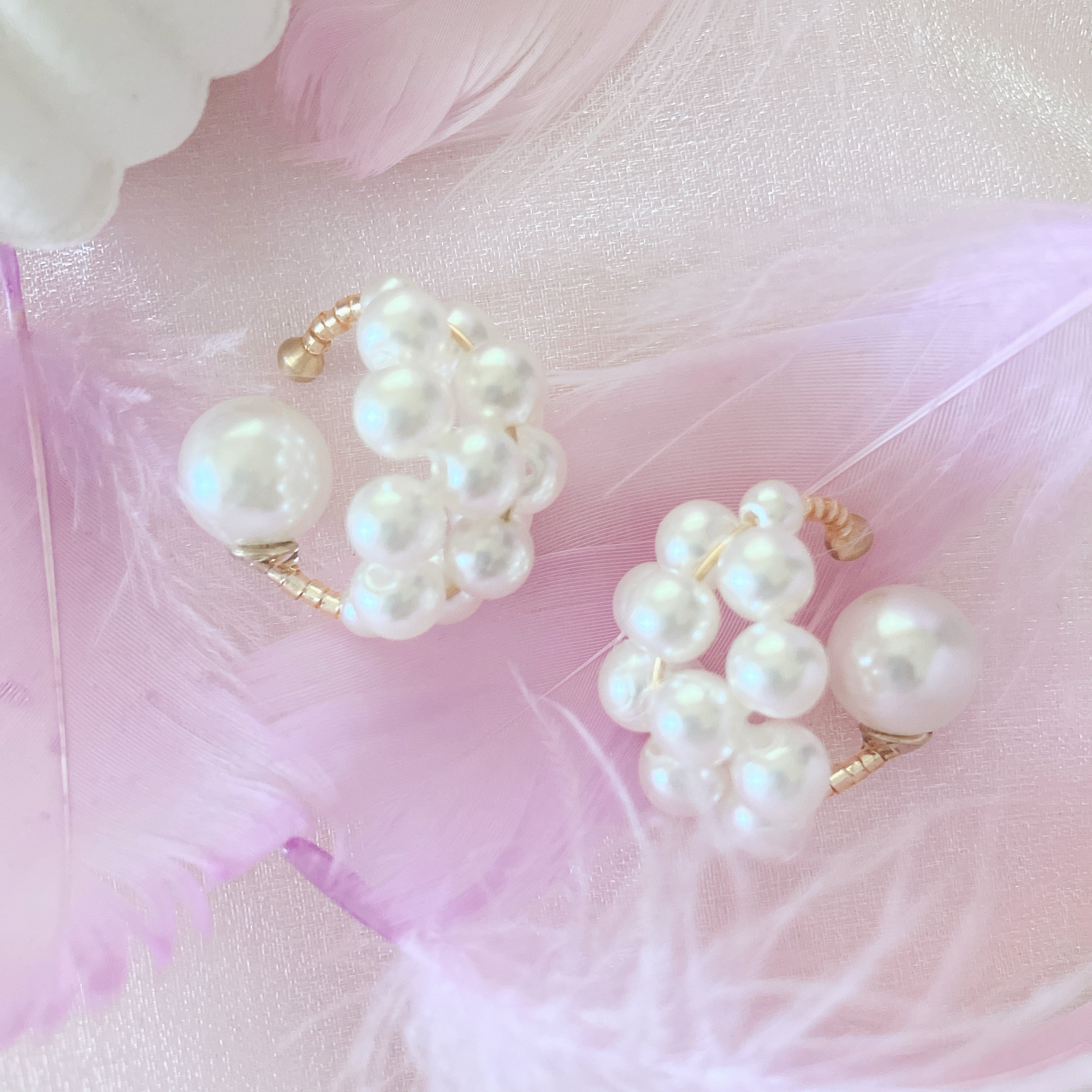 ◉約6ミリのツヤ感パールで作成。ゴールドカラーのビーズは、透明ビーズの内側にゴールドカラーを施したもの。翳風(えいふう)に当てる玉は10ミリサイズのホワイトパール。翳風(えいふう)に当てる玉のサイズ変更(12ミリ、14ミリ)をご希望の方は、お問合せください。