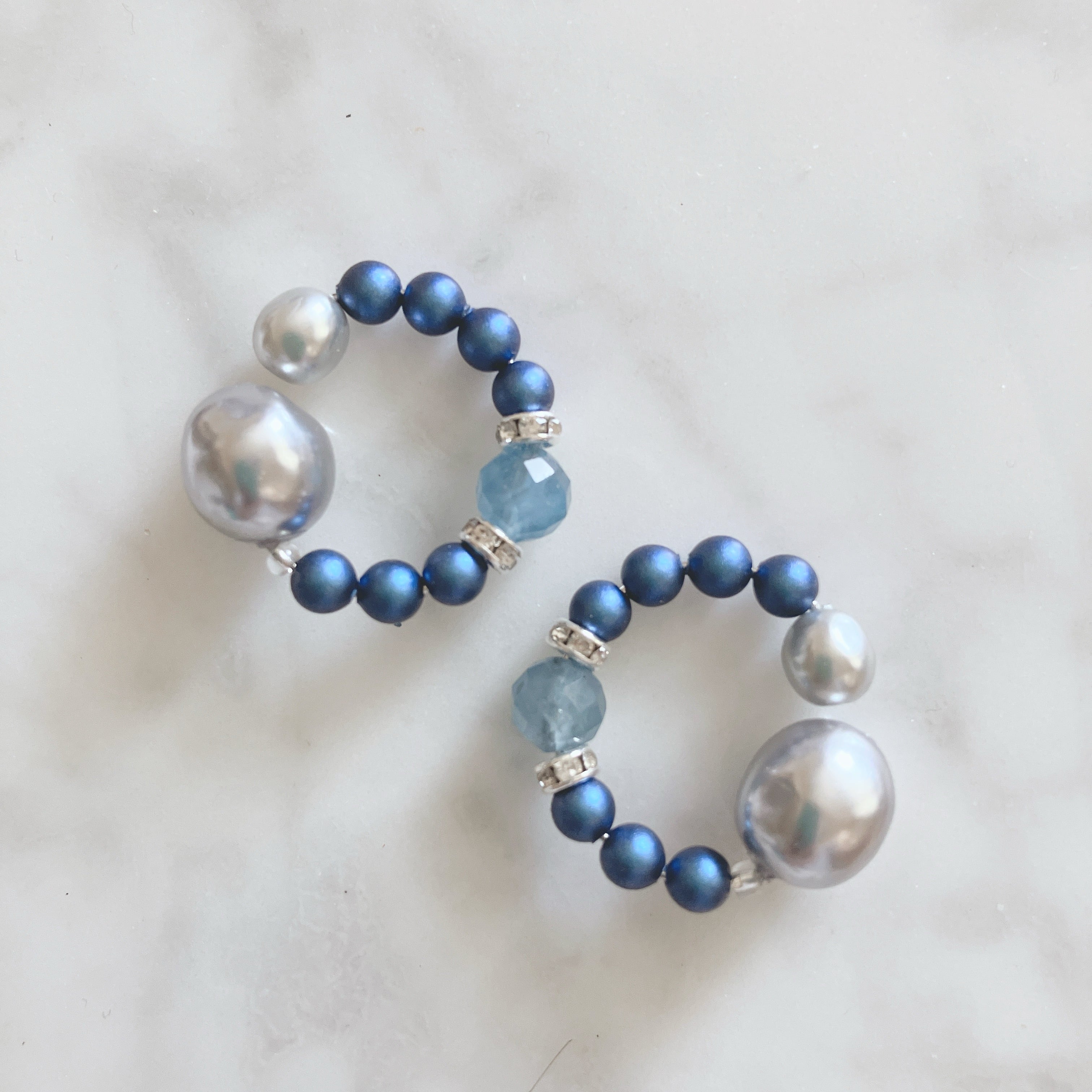 リングのはシルバーカラーで内径は約20ミリを使用。翳風(えいふう)に当てるほうのバロックパールは約10ミリサイズのシルバーグレー。アクアマリンは、約6ミリサイズの深いブルーが綺麗な天然石です。青いパールはクリスタルパールを使用。