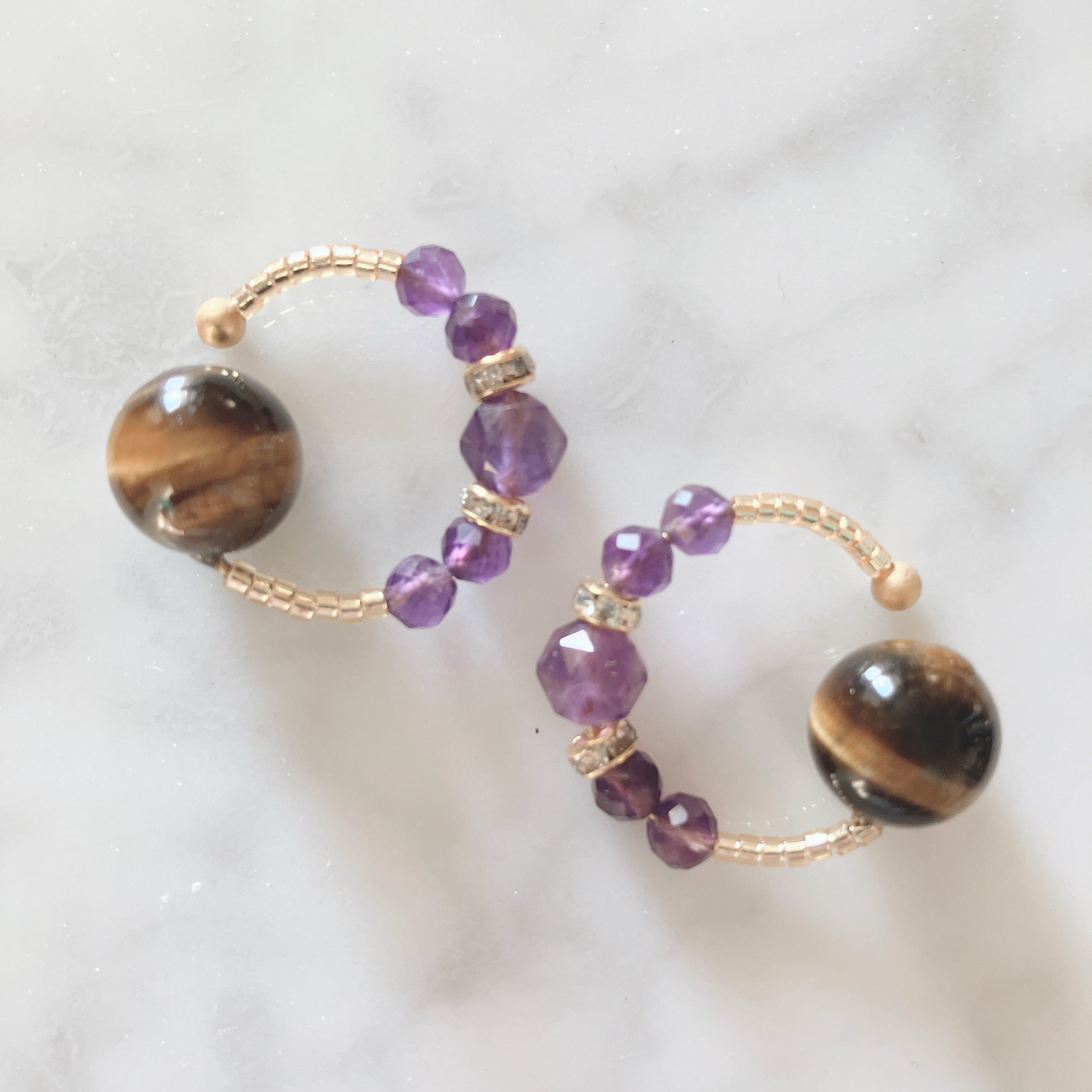 中央の石は6ミリサイズのスターラウンドカットのアメジスト(AA+)。両サイドには約4.5ミリのラウンドカットのアメジスト(AA+)をセッティング。翳風(えいふう)に当てる大きな玉は約10ミリサイズのイエロータイガーアイ。ゴールドのビーズは、透明なガラスビーズの内側にゴールドカラーを施したビーズです。