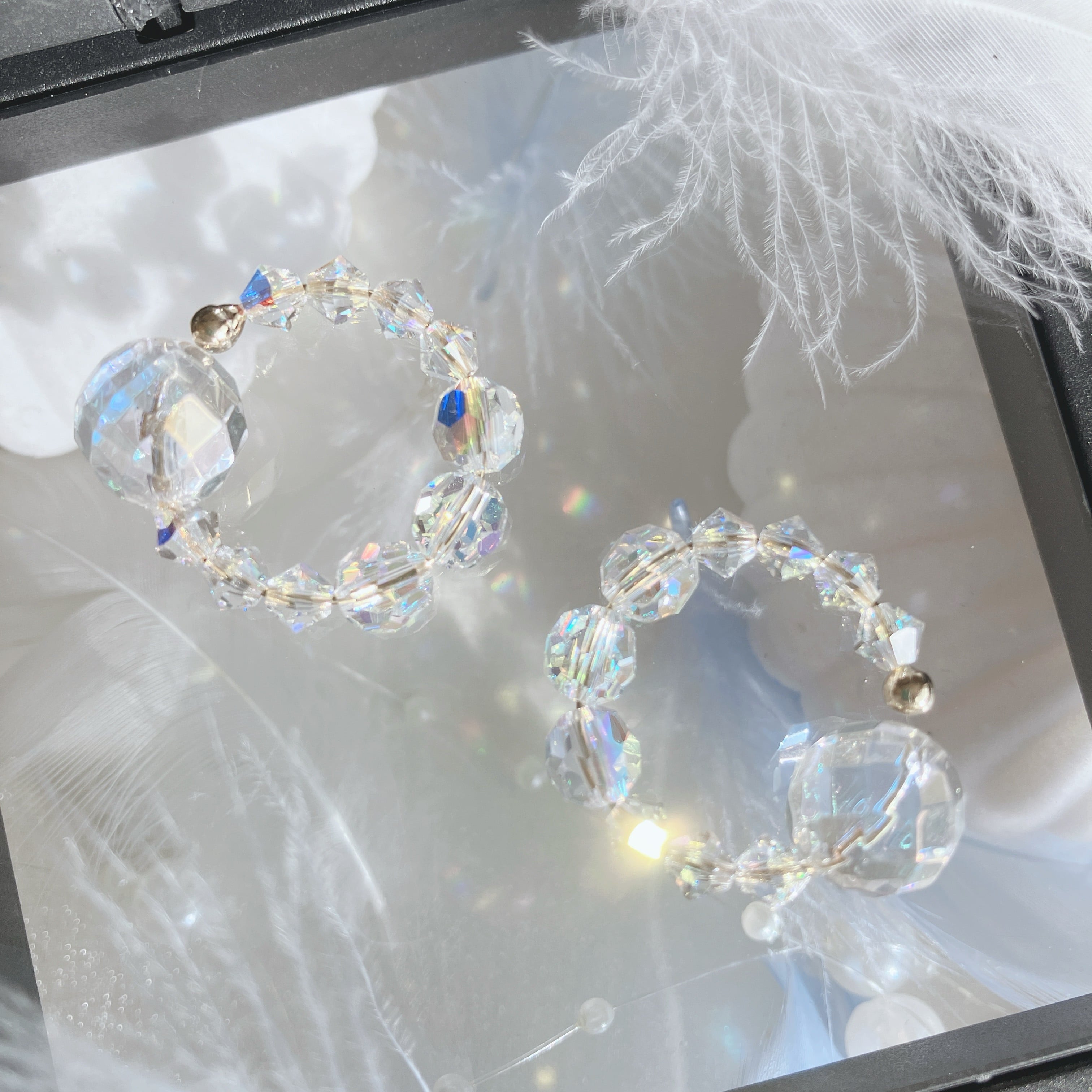 仕様 : 金具の色、ゴールド。内径約20ミリ。大きな玉(約10ミリ)は水晶の表面にオーロラ調のコーティングを施しております。小さなビーズと中くらいのビーズはオーロラコーティングを施したSWクリスタル。キラッキラのオーロラコーティングは、まるでサンキャッチャーのように虹のような光を反射します。